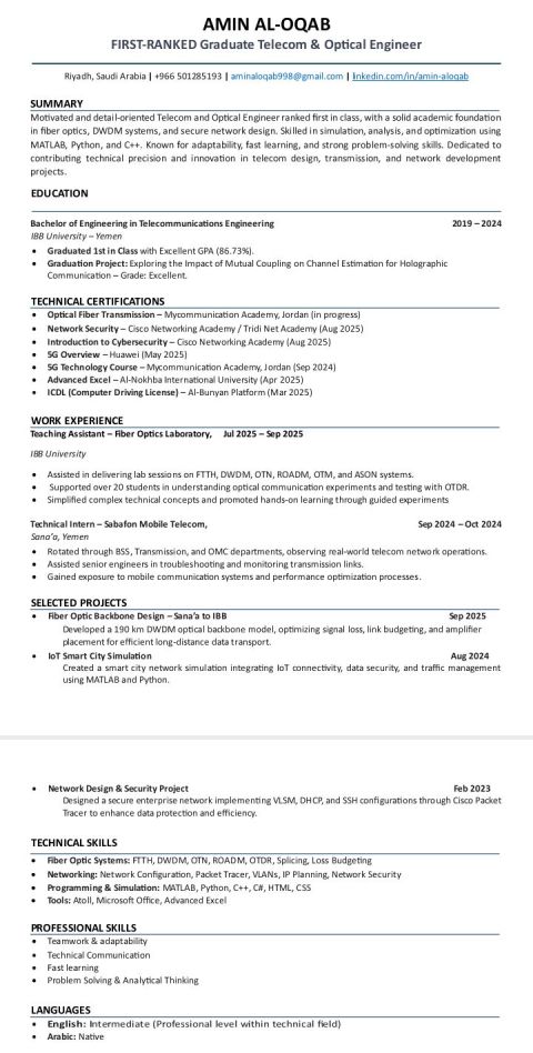 مهندس اتصالات حاصل على درجة البكالوريوس بترتيب الأول على الدفعة. أتمتع بقدرة عالية على التعلم السريع والتكيف مع بيئات العمل التقنية. أسعى للانضمام الى جهة أستطيع من خلالها تطوير مهاراتي الهندسية والمساهمة في تحقيق أهداف الفريق. لدي خبرة أكاديمية وعملية، حيث عملت معيدا لطلاب المستوى الأخير في كلية الهندسة، في مجال الميكروويف نوكيا مقيم حاليا في مدينة الرياض