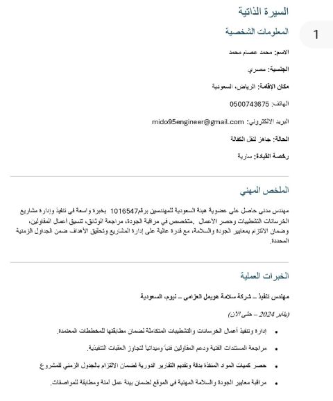 مهندس مدني (تنفيذ) جاهز لنقل الكفالة بخبرة 8 سنوات في تنفيذ المشاريع الانشائية في السعودية. تخصص في تنفيذ المباني خرسانات تشطيبات أعمال بنية تحتية والطرق، مراقبة الجودة أجيد قراءة المخططات، اعداد التقارير، ومتابعة الجداول الزمنية. لدي اجادة للغة الانجليزية والعربية. ابحث عن وظيفة (مهندس موقع) في أي مدينة في السعودية. متواجد في السعودية
