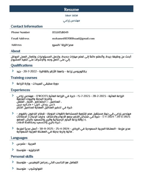 أنا مصري مقيم في منطقة تبوك، سن 26 سنة خريج بكالوريوس علوم زراعية ابحث عن عمل مهندس زراعي اشتغلت مشرف عمال ومشرف موقع واشتغلت مشرف في مزارع واشتغلت سوبر فيزر في شركات المقاولات