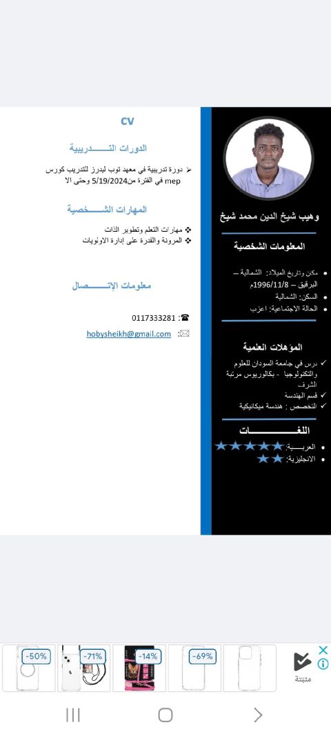 مهندس ميكانيكا خبرة في مجال التصميم الهندسي والانتاج والتركيبات وخبرة في مجال تشغيل ماكينات الليزر والتنايه وخطوط تعريج الصاج