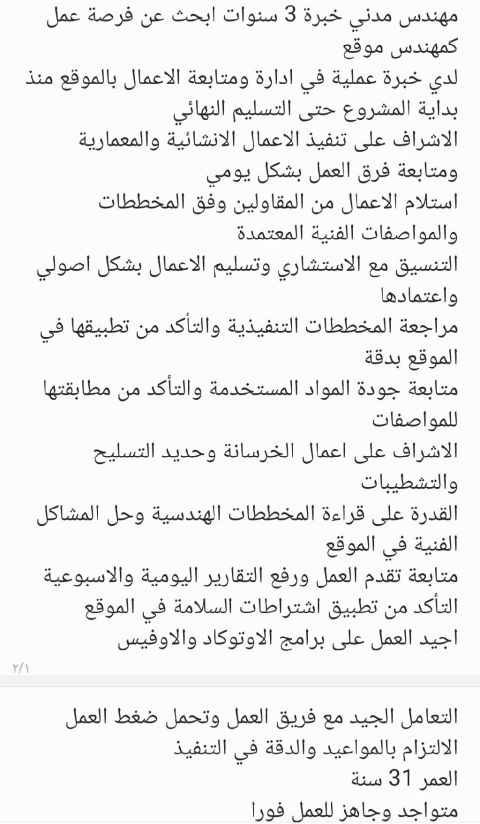 ابحث عن فرصة عمل كمشرف مدني، أو رئيس عمال تشطيبات مدنية، أو متخصص في الإنشاءات، أو الخرسانة، أو التشطيبات، أو أعمال الطرق. لدي دبلوم وشهادات في الاشراف المدني، بالاضافة الى خبرة عملية قوية تمتد لثماني سنوات. أنا متاح للالتحاق الفوري أو الانتقال، وأحمل إقامة سارية المفعول ورخصة قيادة. الراتب المتوقع 5000 ريال سعودي شهريا بالاضافة الى السكن والمواصلات. يمكن لأصحاب العمل المهتمين التواصل معي
