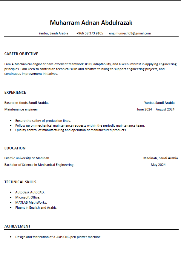 مهندس ميكانيكي حديث تخرج ابحث عن فرصة مناسبة لتنمية مهاراتي واكتساب الخبرات الميدانية والمكتبية، من مهاراتي التأقلم والعمل في فريق وتنظيم الوقت، حاصل على عضوية الهيئة السعودية للمهندسين