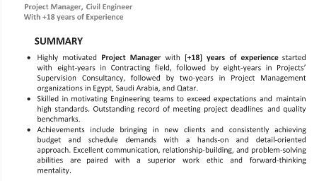 I am an 18 - year experienced civil engineer project manager in the areas of construction, project management, and engineering advisory supervisor with Saudi Arabia and Egypt, and Qatar, I worked 8 years in contractor companies and 8 years as a consultant project manager, and the last two years as owner representative. My last decade is over, and I am now in Riyadh and ready for the move