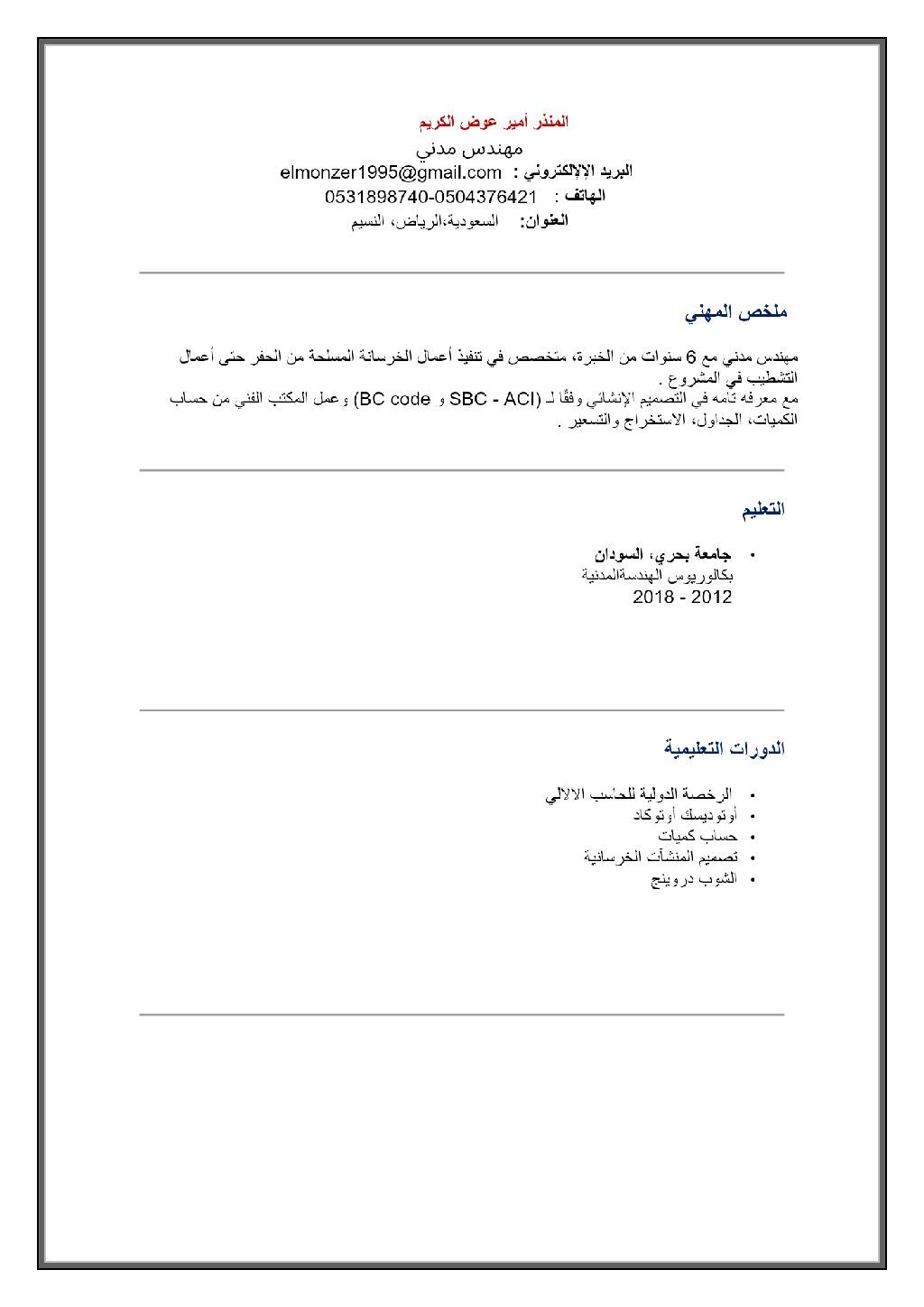 مهندس موقع مدني سوداني مع خبرة 6 سنوات في الاشراف على المواقع بداية من أعمال الحفريات، وأعمال الخرسانة، والتشطيب. اجادة الاوتوكاد ومعرفة تامة بالبرامج الخاصه بالتصميم الانشائي وأعمال الحصر والشوب دروينج جاهز للعمل في كل مناطق المملكة، امتلك أقامه مهنية + رخصة قيادة. للتواصل