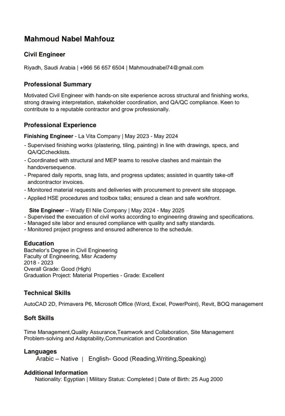 مهندس مدني موقع تنفيذ وتشطيب ولدي القدرة ع أعمال المكتب الفني كحصر الكميات وعمل المستخلصات وأيضا استخدام برنامج البريما فيرا وعمل جداول زمنيه للمشروع والتحكم في تكلفة كل بند والمشروع وأيضا الاوتوكاد وبرامج الأوفيس موجود في الرياض ولدي اقامة سارية مدتها 15 شهر
