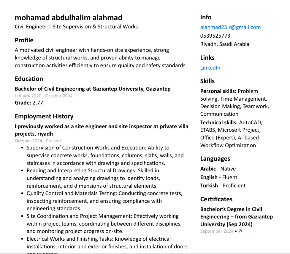 أنا محمد عبد الحليم الأحمد سوري الجنسية، حاصل على بكالوريوس هندسة مدنية من جامعة غازي عنتاب، ولدي خبرة جيدة جدا من خلال عملي في مشاريع فلل خاصة بمدينة الرياض، اضافة الى فترة تدريب موقعي في مرسين - تركيا ضمن مشروع سكني مؤلف من 11 طابقا. امتلك مهارات قوية في الاشراف على أعمال الخرسانة والتسليح، قراءة الرسومات الانشائية، وضبط الجودة ومتابعة التنفيذ، كما أجيد استخدام AutoCAD وETABS وMicrosoft Project، وأتقن