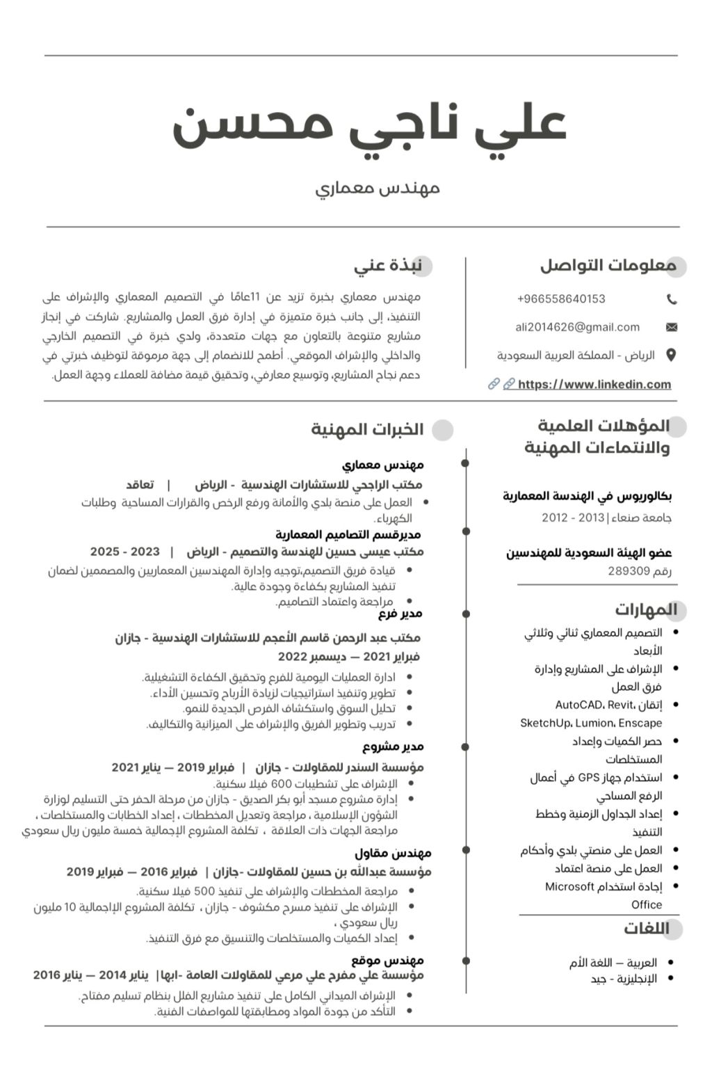 اعلان توظيف - مهندس معماري مهندس معماري بخبرة تتجاوز 11 سنة في مجال التصميم المعماري والاشراف على التنفيذ، عملت على مشاريع سكنية وتجارية ومساجد، أجيد التعامل مع المنصات بلدي - الأمانة احكام الكهرباء - اعتماد. أتقن استخدام برامج التصميم والاخراج المعماري AutoCAD، Revit، SketchUp، Lumion، Enscape. ابحث عن فرصة عمل مناسبة في مدينة الرياض. مهندس - معماري الرياض توظيف تصميم - معماري اشراف