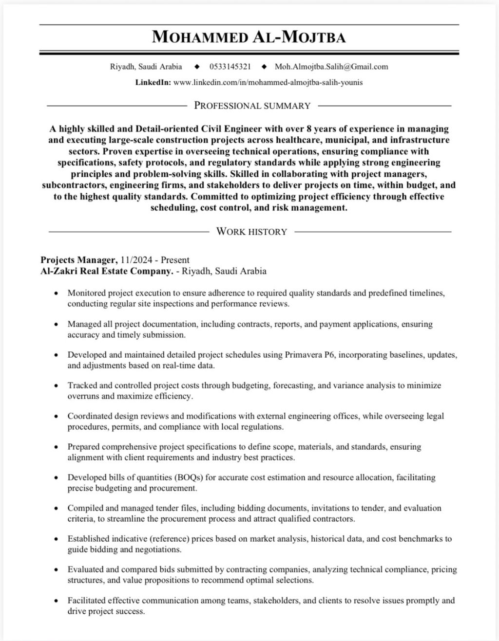 أنا مهندس مدني متخصص في إدارة المشاريع، مع خبرة واسعة في مشاريع وزارة الصحة، وشركة TBC، بالاضافة الى المشاريع الخاصة. تشمل خبرتي جميع مراحل المشروع بدءا من التخطيط، ووضع الخطط التنفيذية والمالية، وقياس الانتاجية، واعداد الجداول الزمنية والمخططات التنفيذية، وحساب الكميات، وصياغة الخطابات الرسمية والاعتمادات والمستخلصات، وصولا الى تسليم المشروع بنجاح. كما لدي مهارات ممتازة في التواصل والتنظيم والتنسيق