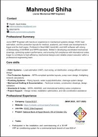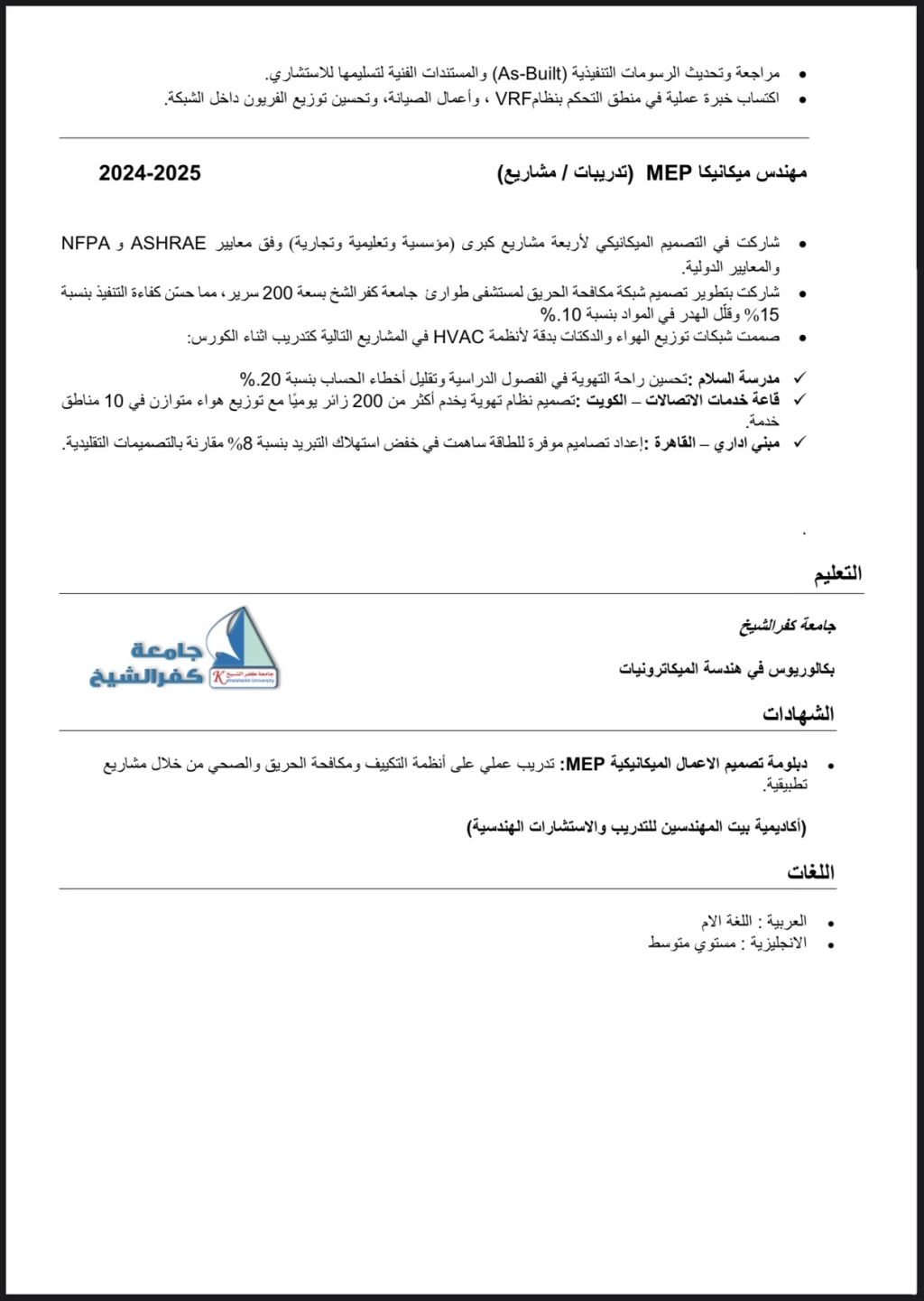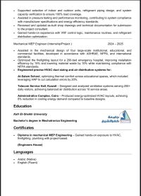Mechanical MEP Engineer specialized in HVAC and Fire Fighting systems. Mechatronics Engineering graduate, January 2025. Based in Riyadh with a Free Visa and available immediately. Experienced in design, site execution, shop drawings and coordination using Revit and AutoCAD, with applied knowledge of ASHRAE and NFPA standards to ensure system efficiency and quality