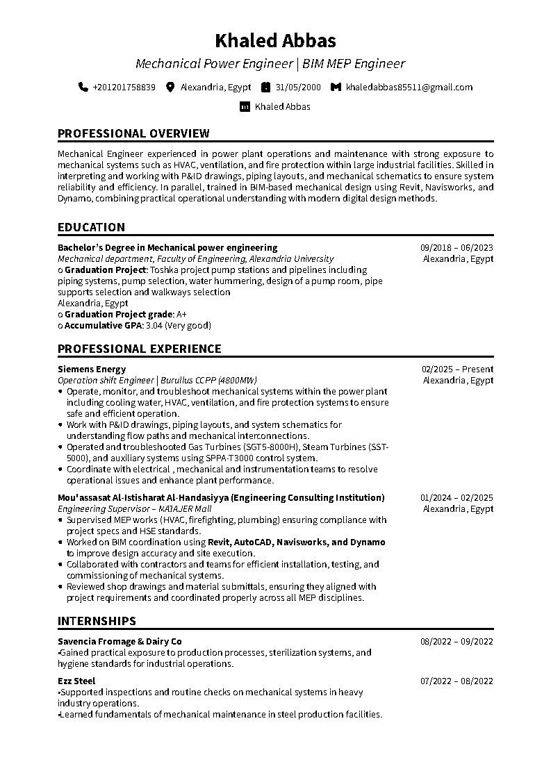 I am a Mechanical Engineer specialized in power generation operations and Building Information Modeling (BIM) as well as MEP systems. I have experience working with Siemens Energy at the Al Burullus Power Plant. In addition to my background in power systems, I also have strong experience in the BIM and MEP fields. I am currently seeking a suitable job opportunity in the Kingdom of Saudi Arabia, and