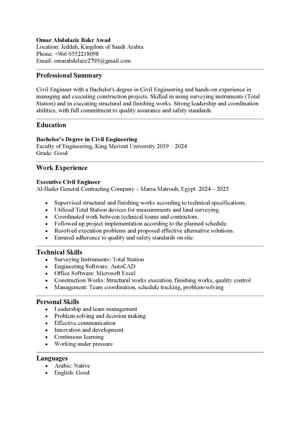 Civil engineer - I am Omar Abdulaziz Bakr Awad, a Civil Engineering graduate from King Meriout University 2024 with hands - on experience in construction execution and land surveying (Total Station) I am currently seeking a suitable opportunity in the civil engineering field within Saudi Arabia