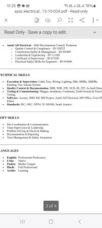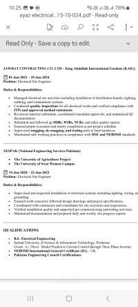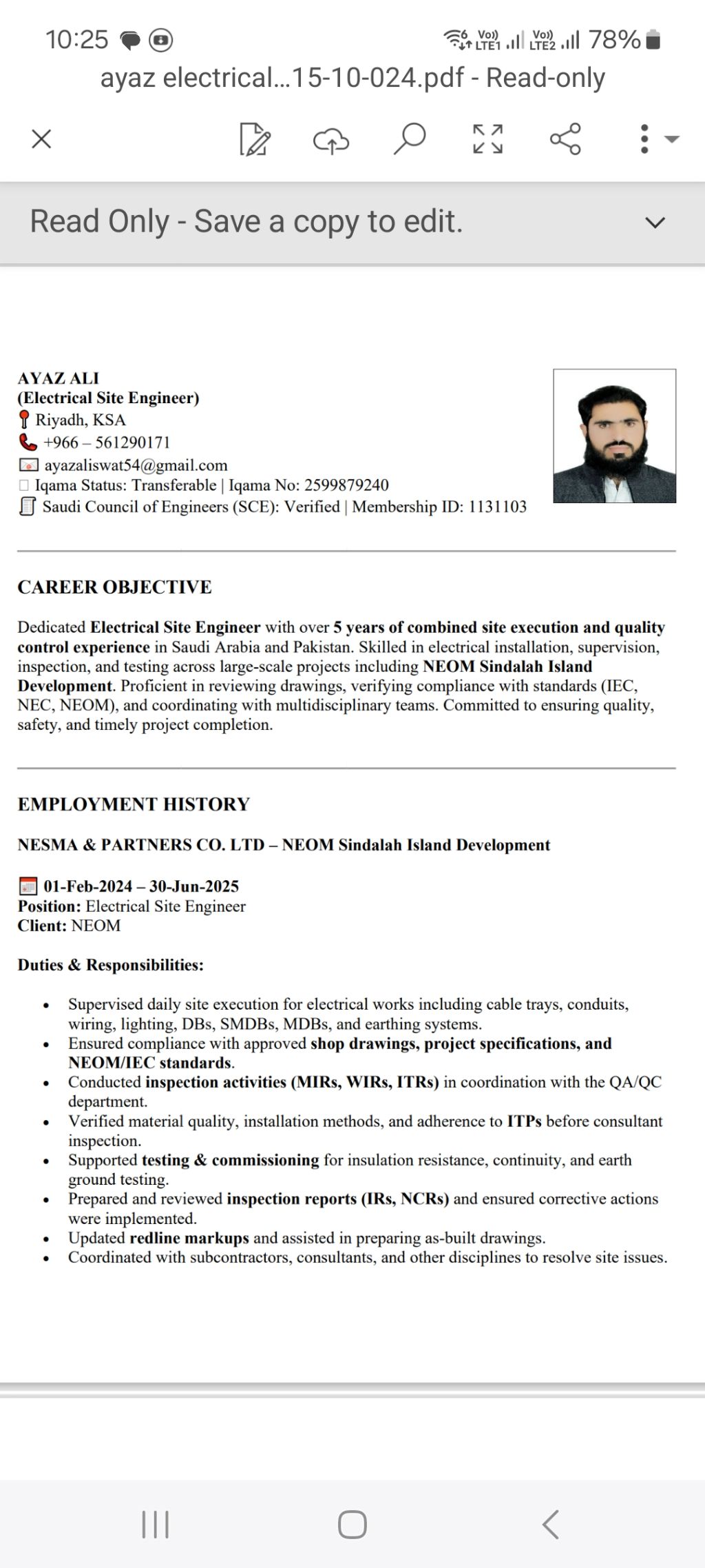 Dear HR, Kindly review my attached CV for the Electrical Engineer position. I have relevant experience in QC, testing, and electrical site works in Saudi Arabia and can join immediately. Thank you for your consideration. Ayaz Ali