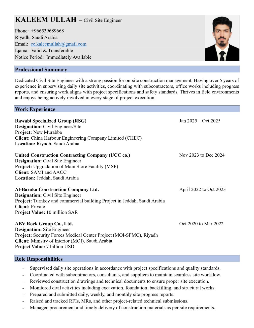 I am a well - experienced Civil Site Engineer available immediately and looking for a suitable job opportunity in Riyadh or anywhere in KSA. Skilled in site supervision, project coordination, material management, and ensuring quality and safety on site. I hold a valid transferable Iqama. If you have any suitable job openings, or if you are aware of any company or individual looking for a Civil Site