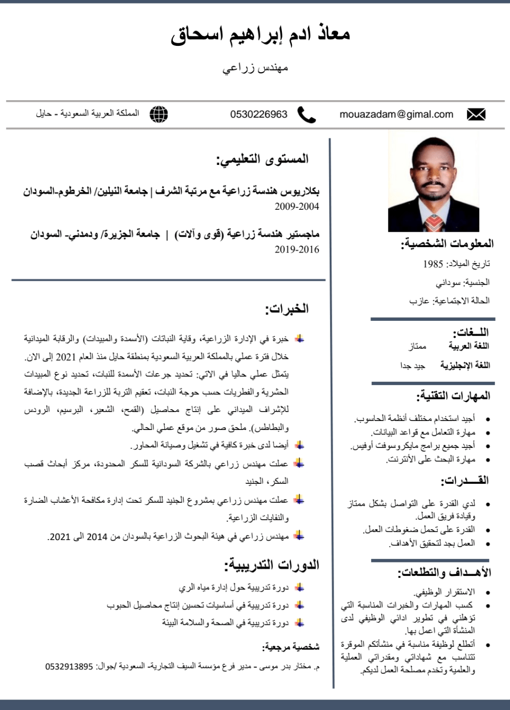 مهندس سوداني مقيم في السودان، ابحث عن عمل لدي خبرة في اإلدارة الزراعية، وقاية النباتات الاسمدة والمبيدات والرقابة الميدانية خلال فترة عملي بالمملكة العربية السعودية بمنطقة حايل منذ العام 2021 الى 2023. تمثل عملي في الآتي تحديد جرعات األسمدة للنبات، تحديد نوع المبيدات الحشرية والفطريات حسب حوجة النبات، تعقيم التربة للزراعة الجديدة، بالاضافة للاشراف الميداني على انتاج محاصيل (القمح، الشعير، البرسيم