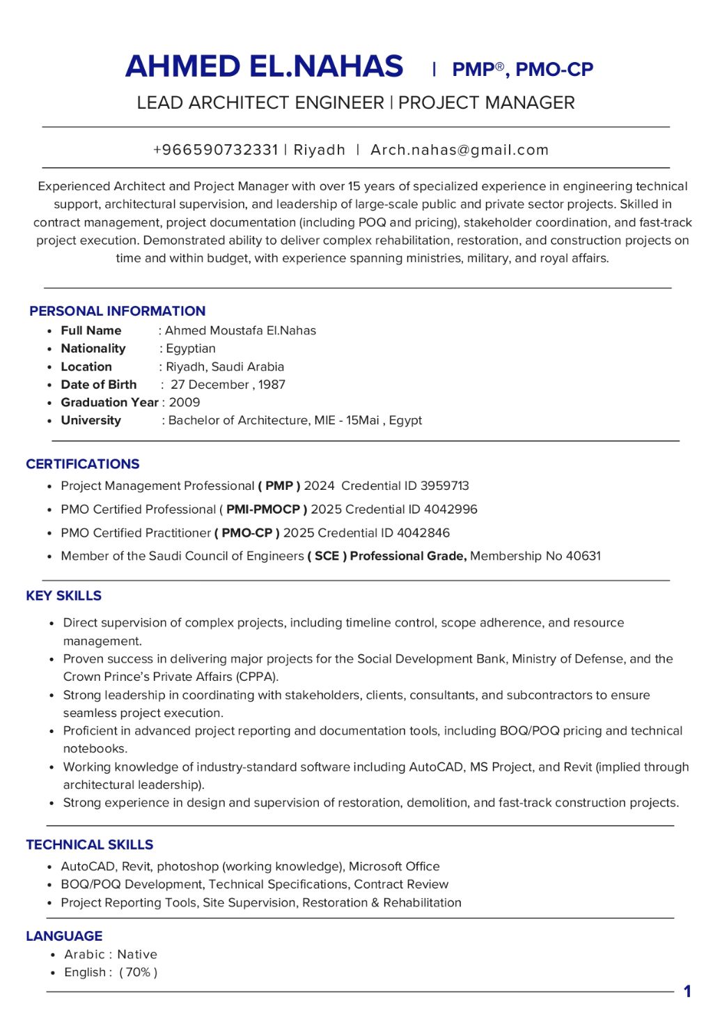على مدار أكثر من خمسة عشر عاما، كانت مهنتي كاستشاري معماري في مشاريع حكومية متنوعة داخل المملكة العربية السعودية. أحمل شهادتي PMP وPMO. تمثلت مهم تي الأساسية في تقديم الدعم الفني الشامل لادارات الهندسة، بما في ذلك اعداد العقود، وتحضير المواصفات والشروط الخاصة والعامة للمشاريع، وجداول الكميات، وتقدير التكاليف، بالاضافة الى إجراء التحليل الفني للشركات المتقدمة لتنفيذ المشاريع