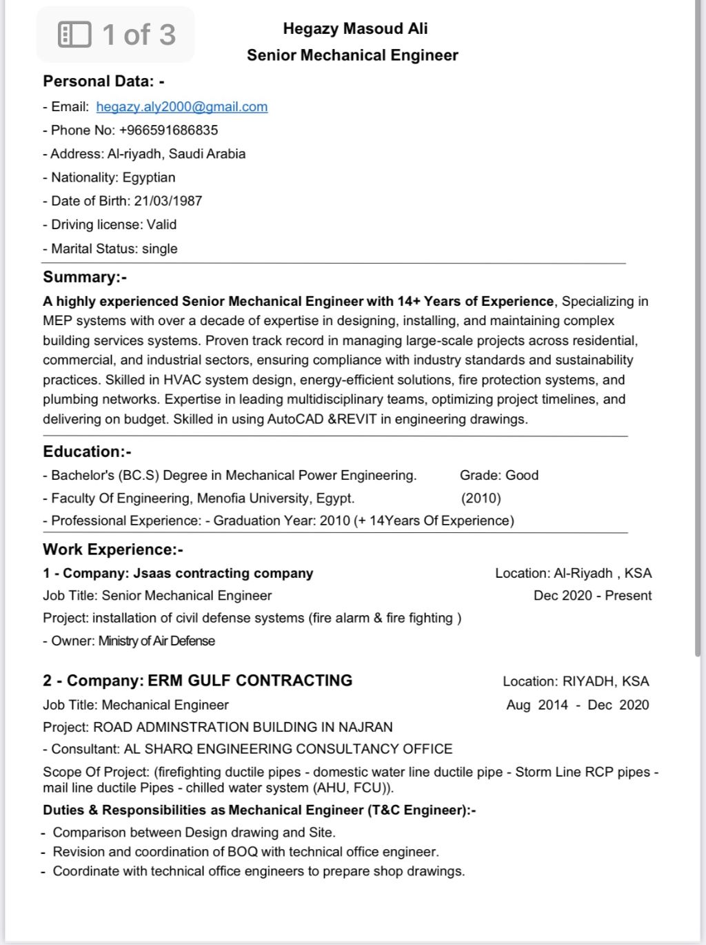 مهندس ميكانيك خبرة 15 عام في الرياض تنفيذ الأنظمة الميكانيكية وأنظمة السلامة خبرة بالمناقصات الحكومية والتسعير