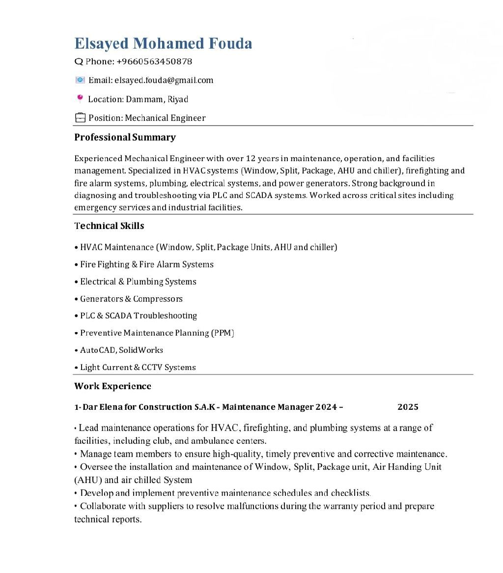 مهندس ميكانيكا متخصص في صيانة وتشغيل وإدارة مرافق التبريد والتكييف (شباك - سبليت - باكدج) بخبرة تمتد لأكثر من 10 سنوات في مجال تشغيل أنظمة HVAC، وأنظمة السباكة والكهرباء والحريق والمولدات والكمبرسور. بارع في اكتشاف الأعطال وتحليلها وايجاد حلول فعالة لضمان استمرارية وكفاءة التشغيل. يتمتع بخبرة عملية في التعامل مع أنظمة التحكم (PLC - SCADA) وإدارة فرق الصيانة، وتطبيق خطط الصيانة الوقائية والدورية