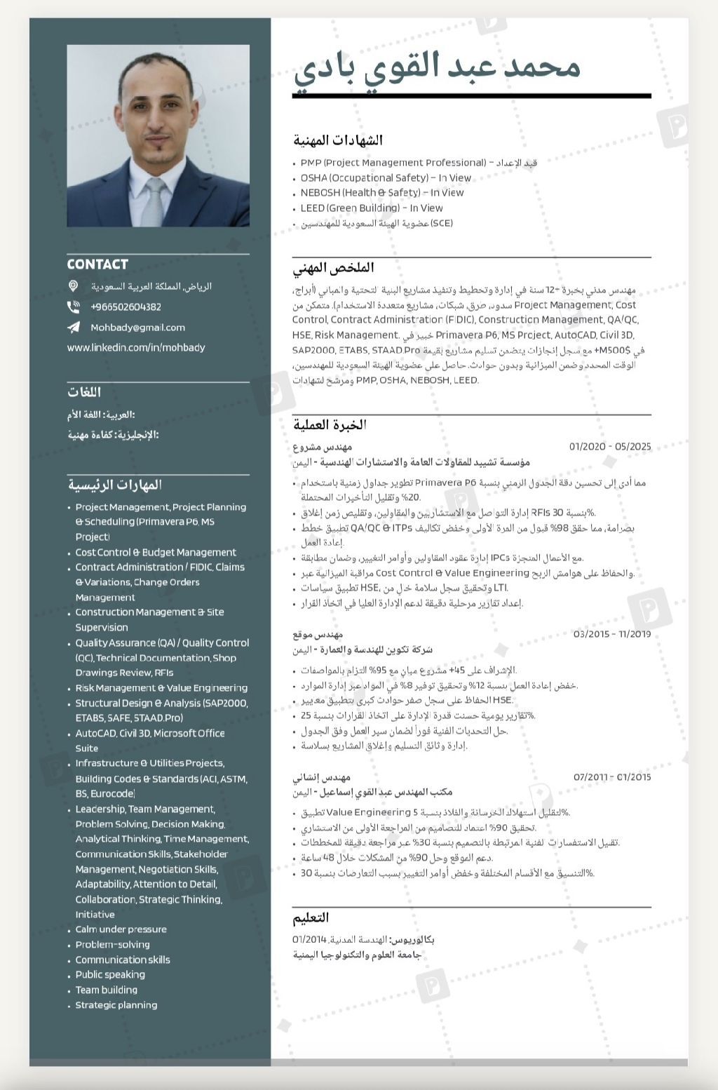 مهندس مدني (انشائي) لدية خبرة 12 عام في عدة مشاريع في مجال المقاولات التي تشمل تصميم وتحليل وتنفيذ واشراف وترميم وتقييم ودراسة وتشطيب واعداد التقارير واستلام الأعمال المنفذة من قبل مقاولين الباطن واعداد بنود المناقصات وتحليل العطائات واعداد تكاليف المنشئات لعدة مشاريع في أعمال المباني والهياكل الخرسانية المسلحة والعادية والهياكل المعدنية المتنوعة التي تشمل الأبراج السكنية والعمارات والفلل