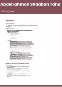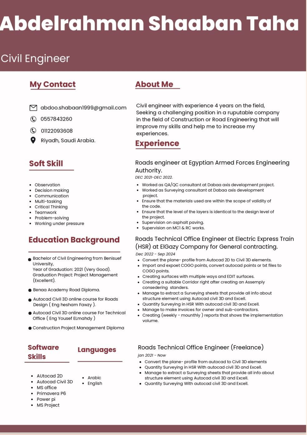 مهندس مدني بخبرة 4 سنوات في مجال هندسة الطرق والمكتب الفني والمقاولات والتشطيبات والتخطيط. يبحث عن منصب في شركة في أحد المجالات الآتية (هندسة الطرق (مكتب فني أو تنفيذ) التخطيط، التشطيبات) ومقره الحالي في الرياض، المملكة العربية السعودية