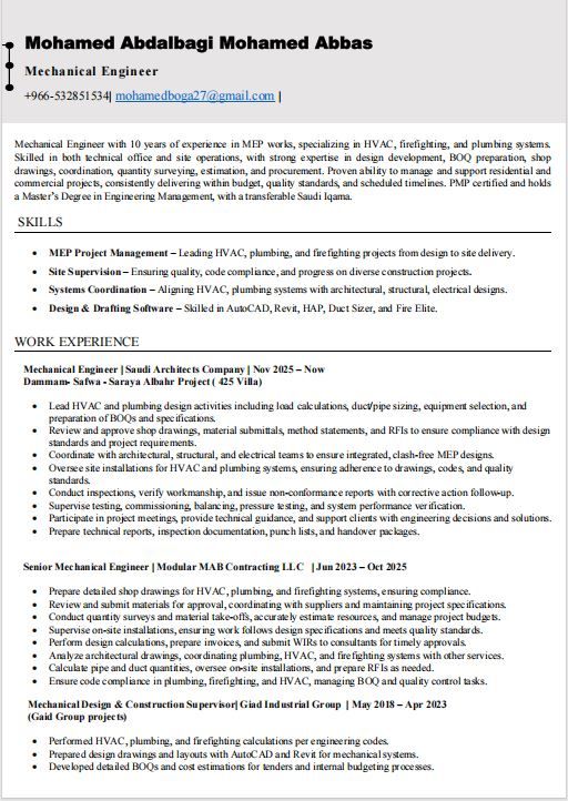 مهندس ميكانيكا سوداني ماجستير إدارة هندسية PMP certified, خبرة أكثر من 9 سنوات في مجال التكييف والسباكة ومكافحة الحرائق، خبرة في المشاريع السكنية والادارية والتجارية والاشراف على الأعمال في الموقع حسب الجدول الزمني للمشروع اجادة أعمال الشوب دروينج وحصر الكميات واعتماد المواد والمخططات، عمل الحسابات التصميمية لأعمال التكييف والسباكة ومكافحة الحرائق، إقامة بمهنة مهندس قابلة للنقل