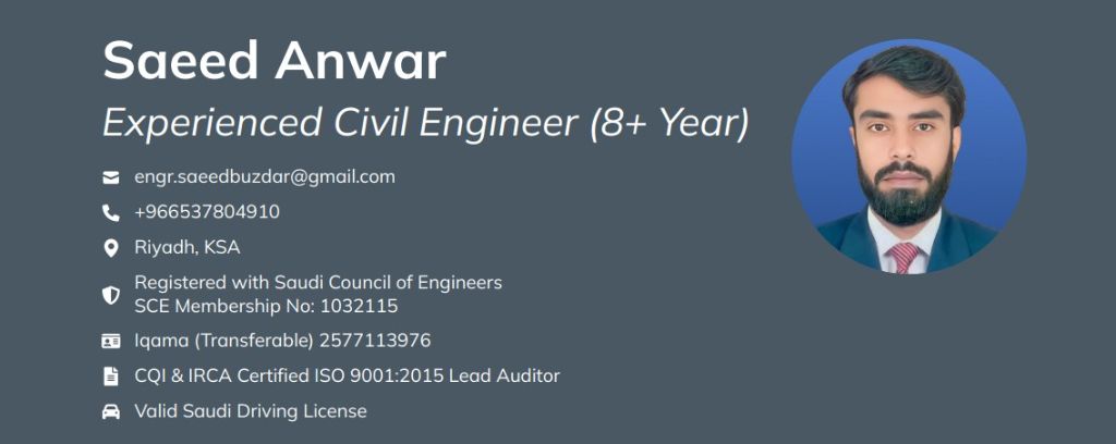 I am a Civil Engineer with over 8 years of experience in consultant supervision, QA/ QC, and construction management for major projects including buildings, roads, utilities, drainage, and structural works across Saudi Arabia. Key Skills & Credentials Registered with Saudi Council of Engineers (SCE) PMP Certified (Project Management Professional - PMI) CQI & IRCA Certified ISO 9001:2015 Lead
