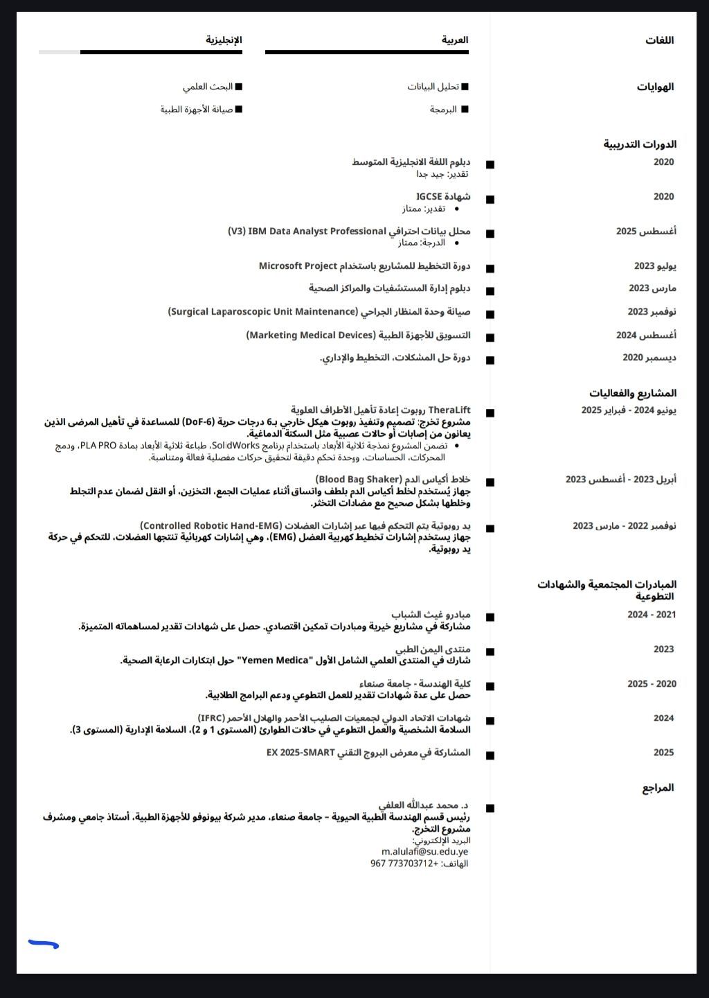 مهندس اجهزة طبية حيوية / مهندس مبيعات / مندوب مبيعات مقيم في الرياض ابحث عن عمل. لدي خبرة سنتين في صيانة الاجهزة الطبية وتشخيص الأعطال الفنية وتقديم الدعم الفني اللازم. وأيضا لدي مهارات متقدمة في البرمجة، التصميم والمحاكاة، ادخال البيانات وتحليلها. موجود رخصة سواقة