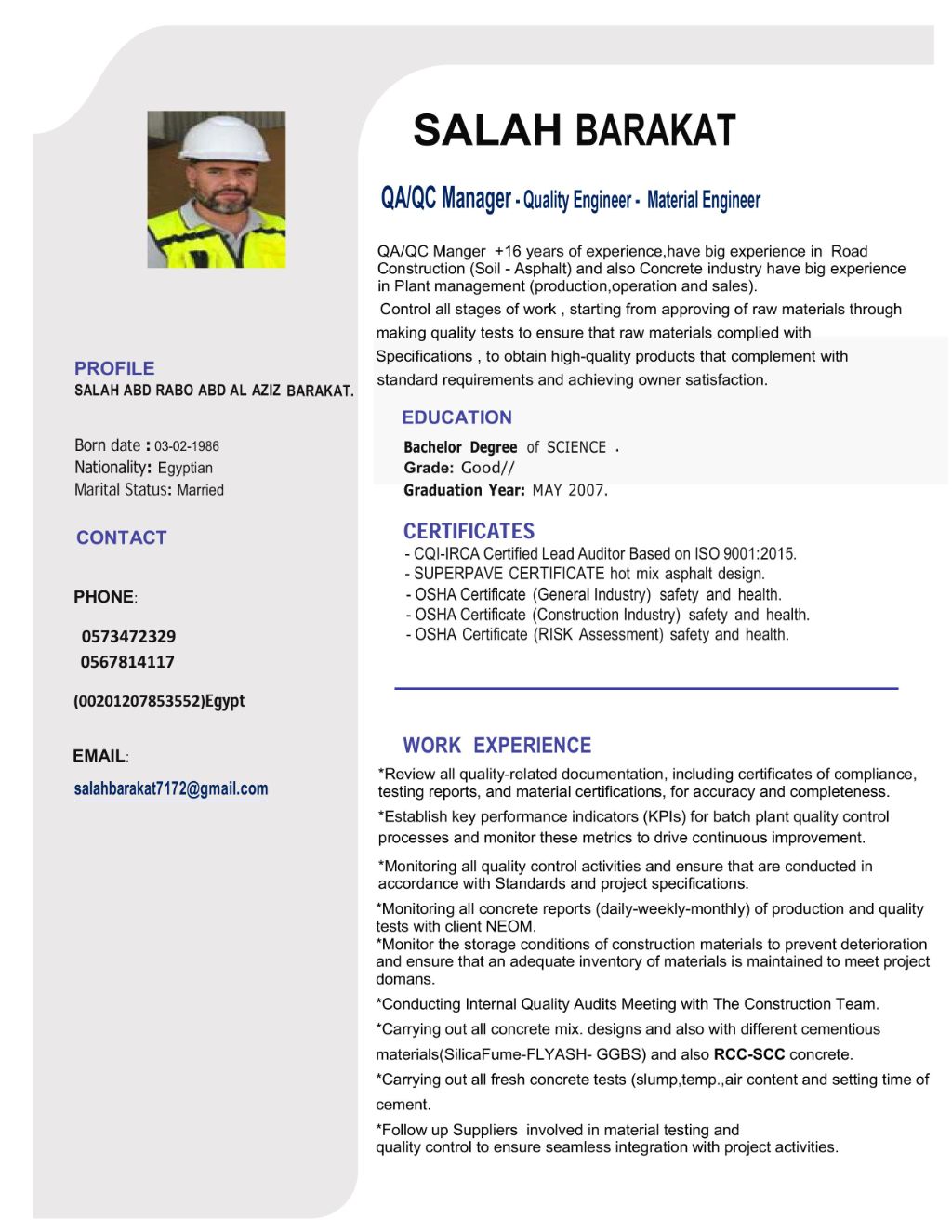 Quality Engineer - Material Inspector with + 16 experience searching for a job in construction field and road