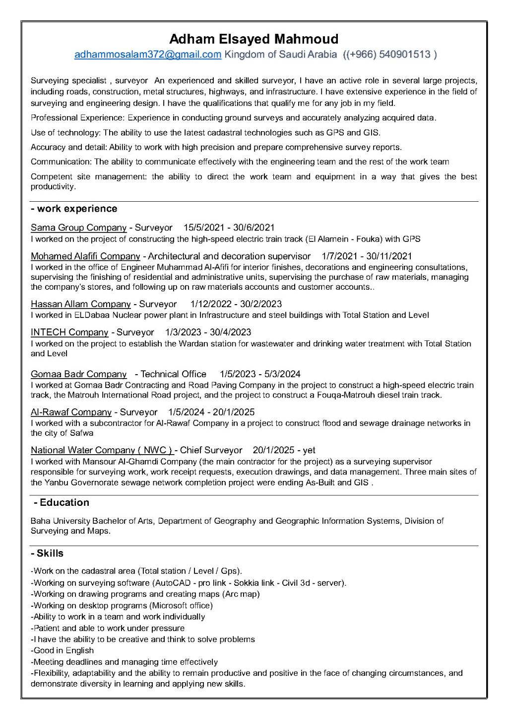 مساح عام خبرة خمس سنوات مسجل هيئة سعودية للمهندسين ومعتمد من شركة المياه الوطنية