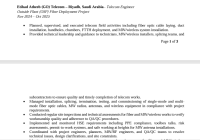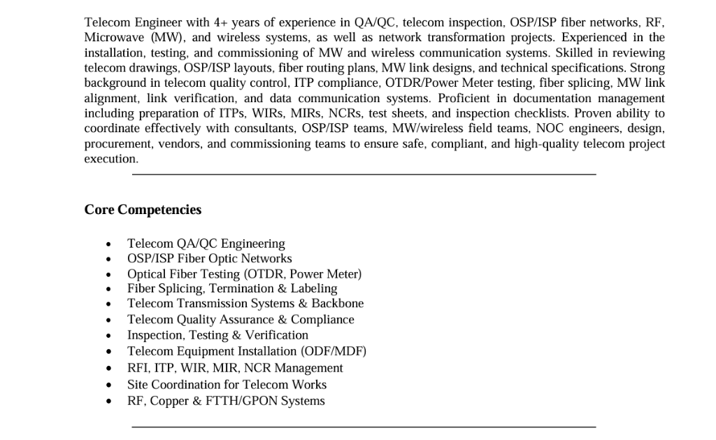 Telecom Engineer with over 4 years of experience in QA/ QC, telecom inspections, OSP/ ISP fiber networks, RF, Microwave (MW) and wireless systems, including network transformation projects. Proven expertise in the installation, testing, and commissioning of MW and wireless communication systems. Highly skilled in reviewing telecom drawings, OSP/ ISP layouts, fiber routing plans, MW link designs, and