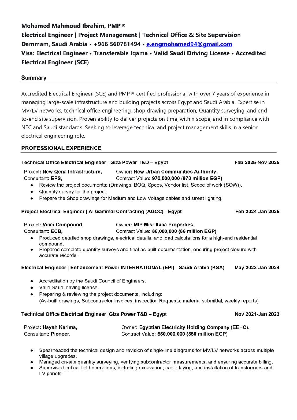Accredited Electrical Engineer (SCE) and PMP ® certified professional with over 7 years of experience in managing large - scale infrastructure and building projects across Egypt and Saudi Arabia. Expertise in MV/ LV networks, technical office engineering, shop drawing preparation, Quantity surveying, and end - to - end site supervision. Proven ability to deliver projects on time
