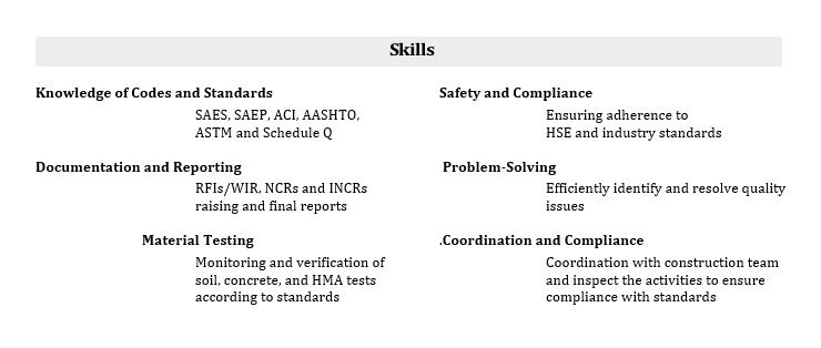 Civil QC Engineer with 6 + years of experience in Structure and infrastructure projects. Skilled in quality control, inspections, method statements, ITPs, and site coordination. Holding valid and transferable Iqama. Strong knowledge of Saudi standards, ensuring compliance, quality, and timely project delivery