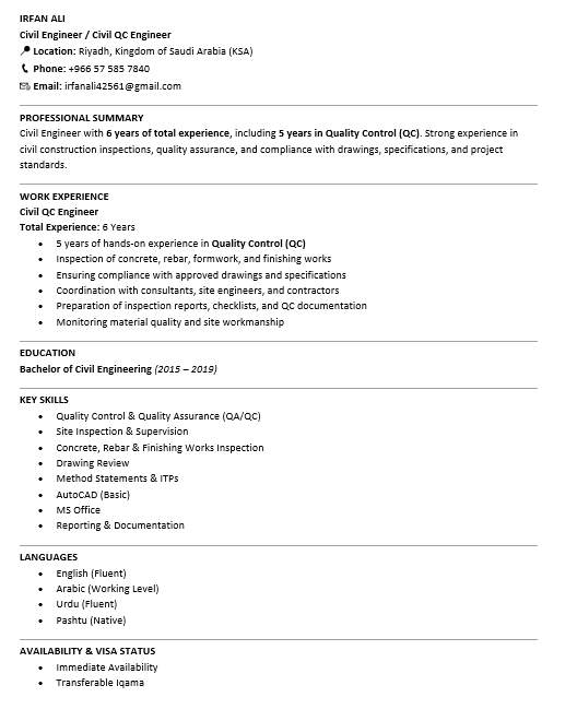Civil Quality Control Engineer with over six years of experience in delivering structural and infrastructure projects. Skilled in inspections, material testing, ITPs, NCRs, and compliance with Saudi codes. Based in Riyadh, committed to quality, safety, timely delivery, and effective coordination with consultants and contractors, and multidisciplinary project teams