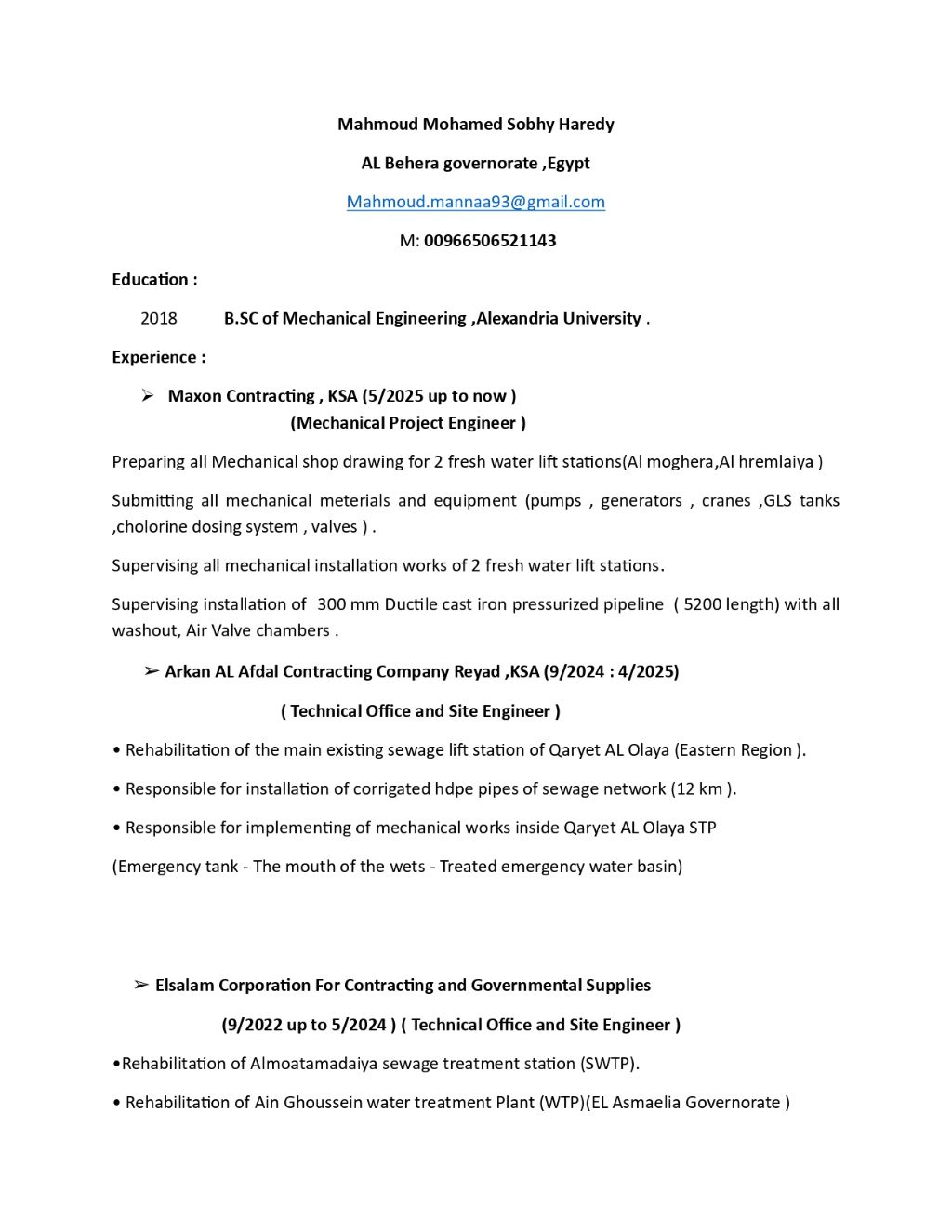 مهندس ميكانيكا مصري الجنسية متواجد في السعودية خريج جامعة الاسكندرية معتمد من هيئة المهندسين السعودية خبرة 8 سنوات في أعمال البنية التحتية كمهندس تنفيذ ومكتب فني شبكات روافع معالجات صرف تنقية مياه محطات RO خبرة أيضا في التشغيل والصيانة للمحطات