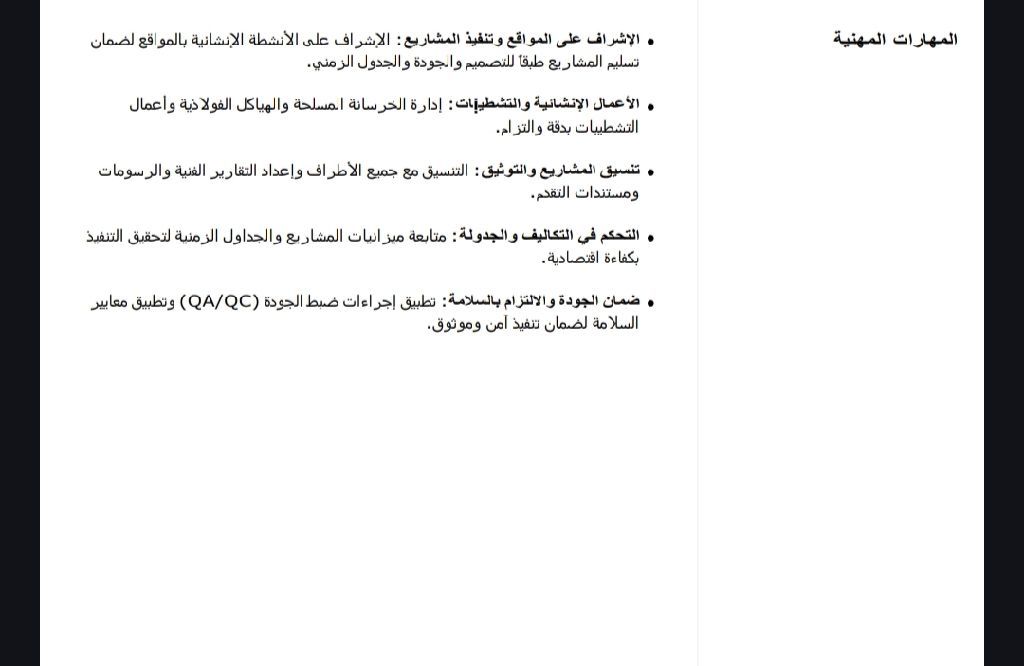 أنا مهندس مدني ابحث عن فرصة عمل امتلك أكثر من 5 سنوات خبرة عملية في الاشراف على المواقع، وإدارة وتنفيذ المشاريع الانشائية، مع خبرة قوية في أعمال الخرسانة المسلحة، الهياكل المعدنية، البنية التحتية، وأعمال التشطيبات. عملت على تنفيذ مشاريع وطنية كبرى في التعاون مع جهات حكومية واستشارية ومقاولين رئيسيين