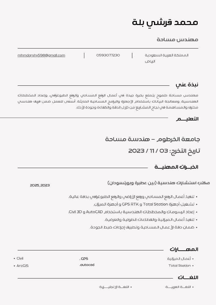 مهندس مساحة خريج جامعة الخرطوم أجيد العمل على الاجهزة المساحية (Total station, level, GPS) وكذلك العمل على البرامج المساحية (AutoCAD, Civil 3D, Arc Gis) ابحث عن فرصة عمل مناسبة