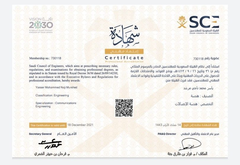 Electrical Engineer (Communications Department) experienced with the unified contract, registered with the Saudi Council of Engineers, holds a driver's license, a Bachelor of Engineering degree, an international computer driving license, and English and computer certifications