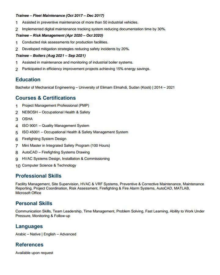 مهندس ميكانيكا - 4 + سنوات خبرة في إدارة المشاريع، الاشراف الصيانة والتشغيل ( O M وأنظمة HVAC & VRF، شاركت في مشاريع كبرى مثل Sidra - ROSHN (PIF)