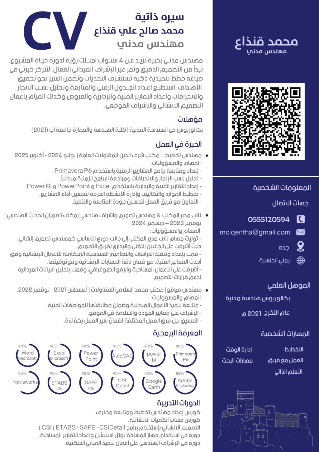 مهندس مدني يمني خبرة تزيد عن 4 سنوات في تخطيط المشاريع والمتابعة والاشراف الهندسي والتصميم الانشائي وحساب الكميات، محترف في البرامج الهندسية، وأجيد المهام التالية اعداد الجداول الزمني ومتابعة المشاريع وعمل التقارير - التصميم الانشائي واعداد الرسومات التفصيلية - الاشراف على تنفيذ الأعمال - استلام وتسليم الأعمال الهندسية - حساب الكميات من اللوحات وفي الواقع