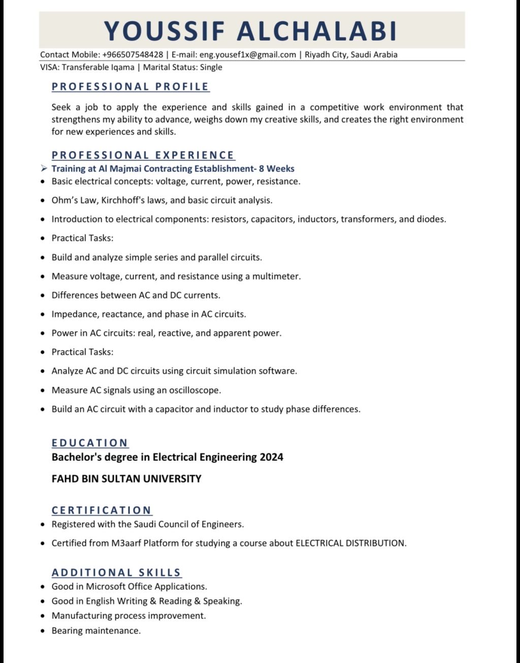 مهندس كهرباء حديث تخرج - مقيم (إقامة قابلة للنقل) ابحث عن فرصة عمل خريج من المملكة العربية السعودية وحاصل على شهادة عضوية هيئة المهندسين متفرغ وجاهز للعمل مقيم في مدينة الرياض