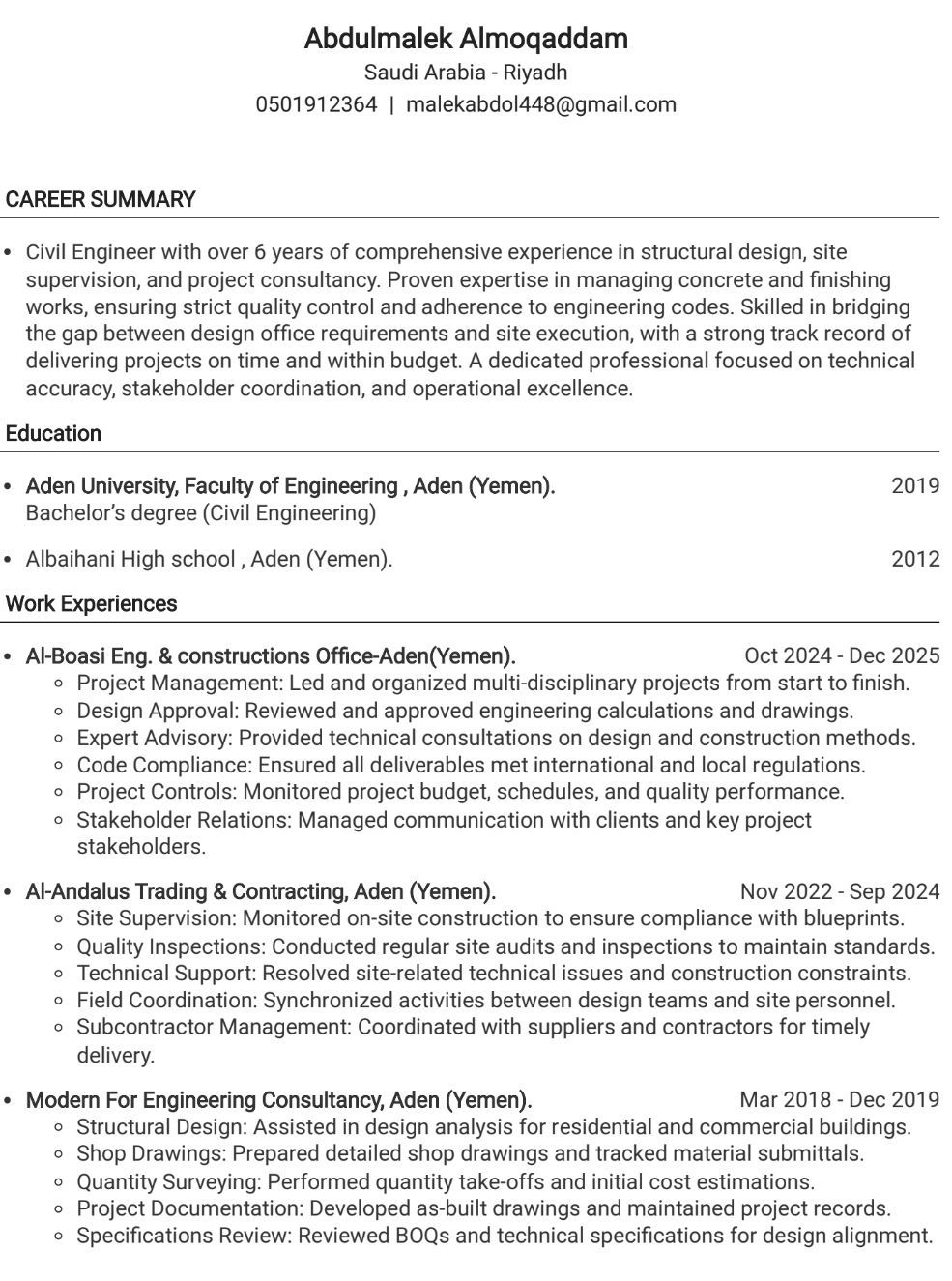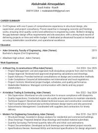 Civil Engineer with 6 + years of experience in construction & integrated finishing projects. Highly skilled in combining site supervision with technical office duties, including shop drawings, accurate quantity surveying, and payment certificates. Proficient in managing concrete & finishing works per specs and schedules, with a talent for coordinating contractors & consultants to ensure quality