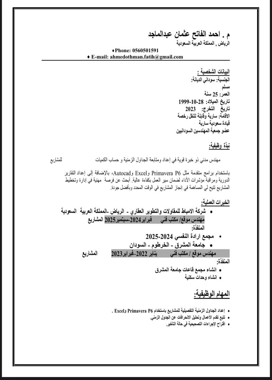 مهندس مدني سوداني مقيم في الرياض، خبرة أكثر من 3 سنوات في الاشراف الموقعي، مراقبة الجودة، أعمال المكتب الفني، حساب الكميات واعداد Shop Drawings للمشاريع الانشائية داخل السودان والسعودية. حاصل على بكالوريوس هندسة مدنية من جامعة الخرطوم، وأتقن استخدام AutoCAD وPrimavera وMicrosoft Office. اقامة قابلة للتحويل، رخصة قيادة، وجاهز للعمل فورا. واتساب فقط البريد الألكتروني