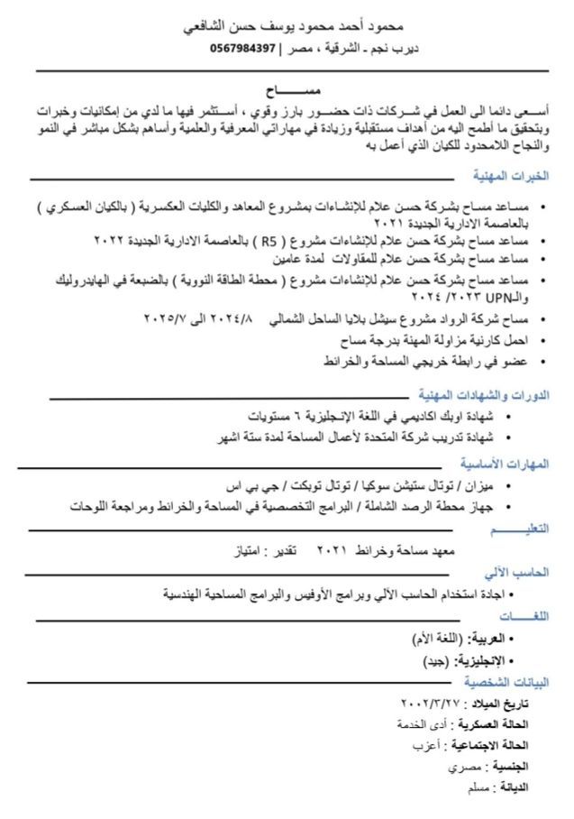 ابحث عن فرصة عمل في مجال المساحة. امتلك خبرة عملية أكثر من 5 سنوات في شركات مقاولات كبرى ومشروعات قومية، بدأت كمساعد مساح ثم مساح مواقع الخبرات العملية العمل على مشروعات المعاهد والكليات العسكرية مشروعات العاصمة الادارية الجديدة (R5) مشروع محطة الطاقة النووية بالضبعة (UPN) مشروع مارينا في الساحل الشمالي أعمال الطرق والمباني والإنشاءات المهارات الفنية العمل على الميزان التوتال ستيشن جهاز GPS رفع