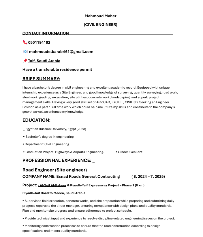 Civil Engineer with experience in roads and infrastructure projects seeking a job opportunity within Saudi Arabia. Experienced in supervising site works and managing field activities, including road works (earthworks, grading, asphalt) and infrastructure works (drainage, water networks, culverts) Skilled in coordinating with consultants and contractors to ensure works are executed according to approved