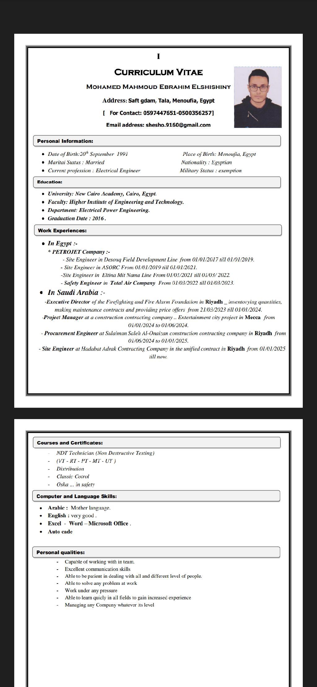 مهندس كهرباء خبرة 9 سنين منهم 3 في المملكة متواجد في الرياض متاح مباشرة العمل فورا متاح نقل كفالة الإقامة سارية رخصة قيادة سارية عضوية في الهيئة السعودية للمهندسين سارية معي شهادة أوشأ في السفتي. عملت في العقد الموحد في الجهد المتوسط عملت في الاطفاء والانذار عملت في المقاولات الانشائية عملت كمشتريات عملت كمدير تنفيذي عملت كمدير مشروعات ليس لي في التصميم لكن قوى في التنفيذ والإدارة والاشراف