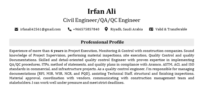 Quality Control Civil Engineer with over six years of hands - on experience in structural and infrastructure projects. Proficient in project supervision, QA/ QC inspections, material approvals, and quality documentation including RFI, MIR, WIR, NCR, and PQD. Skilled in vendor coordination and technical team support. Holds a valid, transferable Iqama