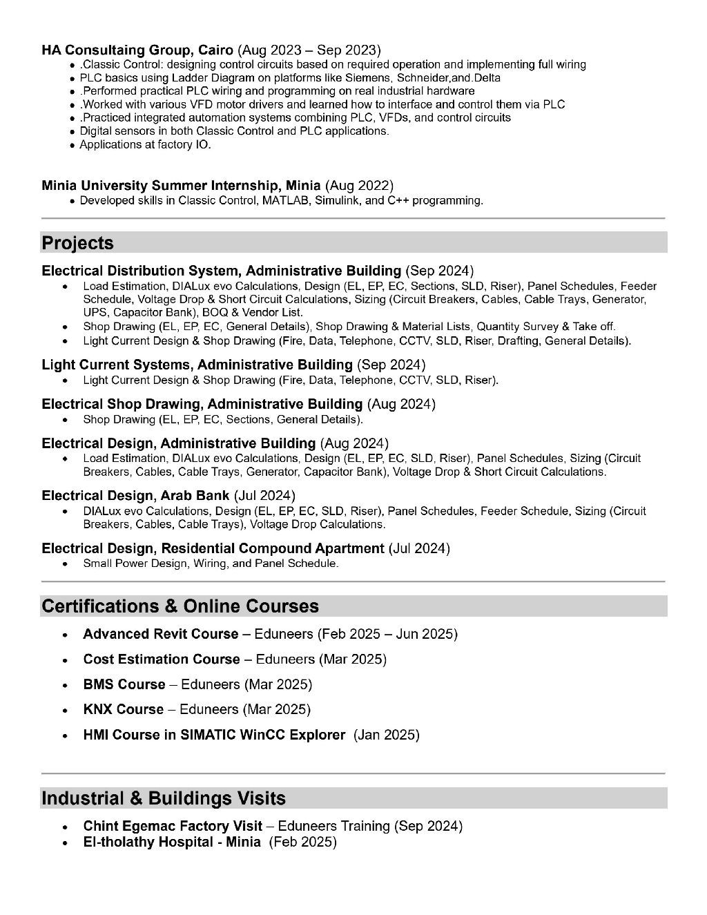 مهندس كهرباء باور خريج جامعة المنيا خريج دفعة 2025 واشتغلت في مجالات (كنترول - توزيع - مقاولات - لوحات) واشتغلت على برامج التصميم مثل AutoCAD, DIALUX EVO, Revit وبرامج PLC مثل TIA Portal, Simatic Manager، وكمان عندي خبرة في تنفيذ أعمال المواقع وحاليا موجود في الرياض عقد عمل