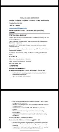 Razan, a graduate with a Bachelor's degree in Chemical Laboratory Sciences. I have knowledge and experience in food quality and safety, and I hold a Highfield - approved certification (HACCP Level 3) I am also familiar with laboratory procedures and quality analysisI. I am seeking a full time job opportunity in a chemical laboratory, food safety, or quality management, I have a valid transferable Iqama
