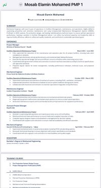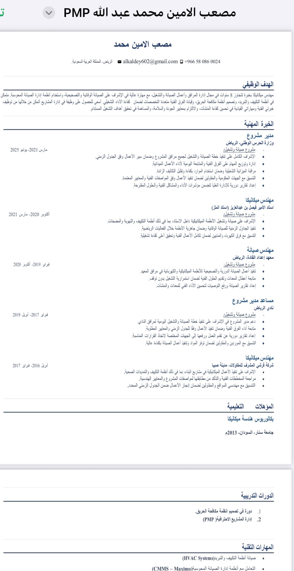 مدير مشروع (مهندس ميكانيكا) مدير مشروع المسمي الوظيفي مهندس ميكانيكي خبرة في مجال الصيانة والتشغيل في عدة مشاريع حكومية منها مشاريع وزارة الرياضة ومشاريع وزارة الحرس الوطني خبرة أكثر من 12 عام اعتماد من الهيئة السعودية للمهندسين أقامه سارية وقابلة للنقل رخصة قيادة السكن الرياض