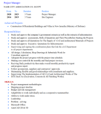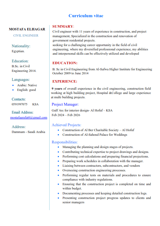 مهندس مدني خبرة عملية 11 سنة منها سنتين بالمملكة (الأعمال الانشائية وأعمال التشطيبات والمكاتب الهندسية الاشراف على التنفيذ) لدي خبرة بأعمال التنفيذ والأشرف على المشاريع الحكومية والخاصة وادارة الموقع وضبط الجودة وحصر الكميات ومتابعة الجداول الزمنية للأعمال واعداد التقارير الدورية ورفع المستخلصات. مسجل بالهيئة السعودية للمهندسين وأحمل إقامة سارية قابلة للنقل ورخصة قيادة سعودية سارية. متواجد في الدمام