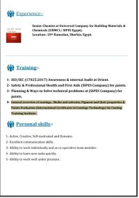 Senior chemist paints industry experienced 9 years Research, Development and Quality department in paints & coatings then 3 years in production department till now